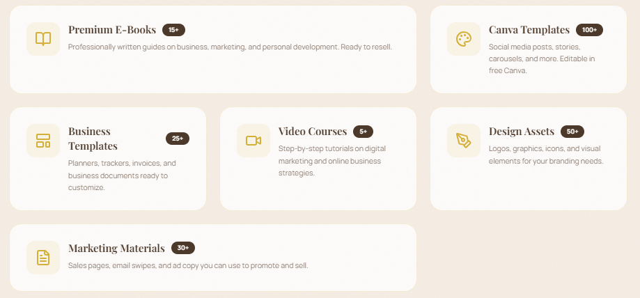This is your complete business-in-a-box. Everything you need to start earning from digital products, without the months of creation time.